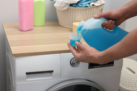 Man pouring fabric softener from bottle into cap near washing machine indoors, closeup