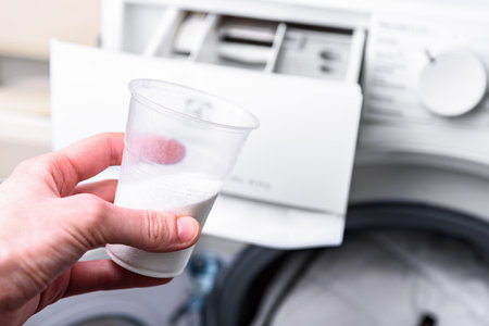 Washing powder detergent and measuring cup pouring into machine.