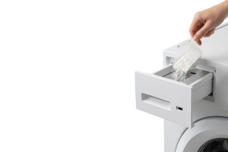 Close-up of a woman's hand pouring laundry detergent into the powder compartment of the washing machine