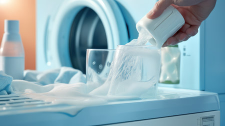 Hand pours liquid powder into the washing machine.
