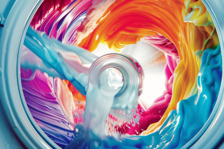 A swirl of colorful detergent mixes with water in a washing machine, depicting the dynamic motion and cleaning power of laundry products.