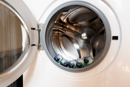 Laundry capsules placed in the washing machine drum, showing eco-friendly detergents that are safe for both health and the environment.