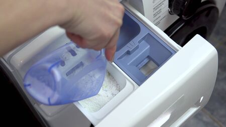 A young woman pours detergent into a washing machine. A woman fills powder and pours liquid into a special compartment in the washing machine. Hand close-up.
