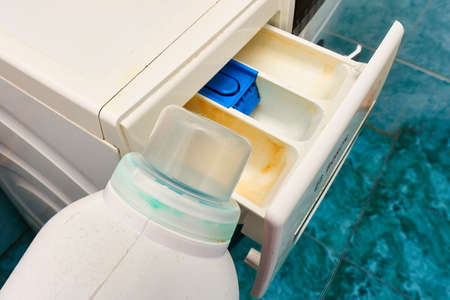 Detergent and fabric softener in the washing machine.
