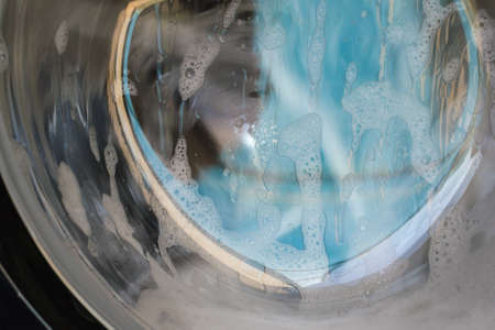 A captivating close-up of splashing water inside a washing machine drum, showcasing dynamic motion and refreshing bubbles. Ideal for home appliance themes.