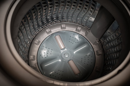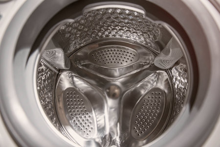 Empty, clean, domestic washing machine or drier drum. Wide angle inside view, close up, no people.