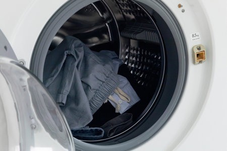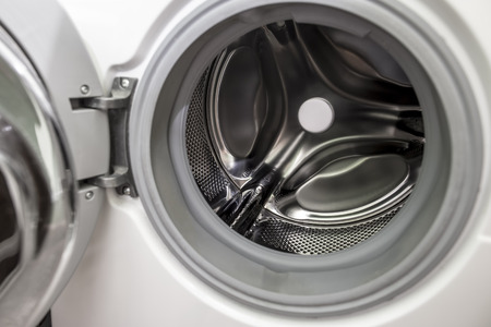 Opened door of empty washing machine with a drum and a horizontal load of laundry
