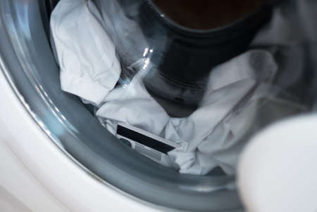 placing laundry in a washing machine in a tank filled with water. High quality photo