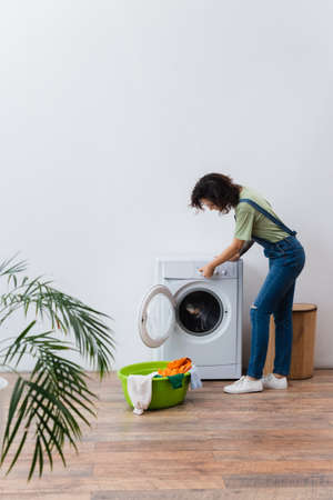 cropped view of housewife putting clothes into washing machine near laundry bowl and basket