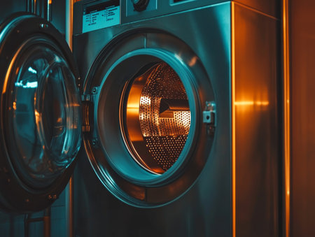 A dark room of a publiÑ laundry with multiple washing machines inside, selective focus on the open door of one of the tumble dryers, shallow depth of field, strong bokeh