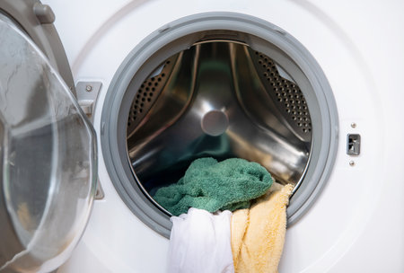 Closeup view from inside the washing machine, full of colorful clothes inside and opened door