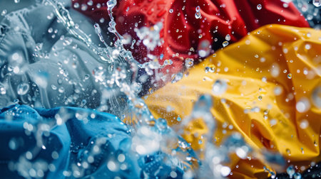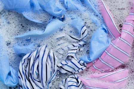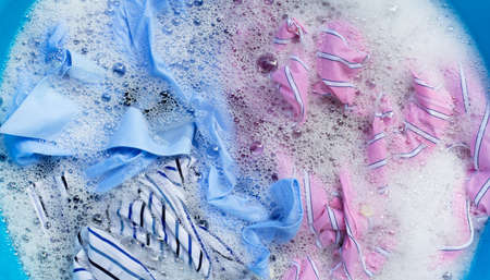 Top view of color clothes soak in powder detergent water dissolution. Laundry concept