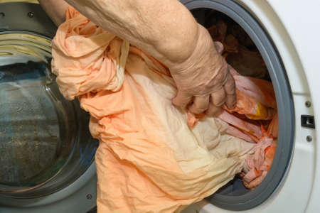 placing laundry in a washing machine in a tank filled with water. High quality photo
