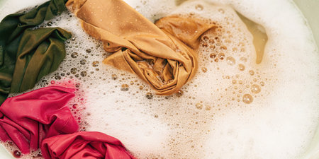 Colorful clothes soak in soapy water in a laundry basin.