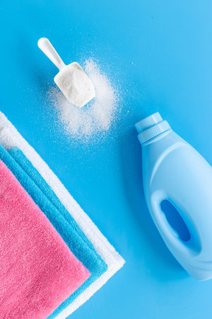 Detergent powder with measuring spoon for clothes washing on blue backgrond. Laundry concept.