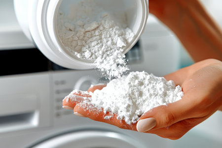 Womans Hand Carefully Pours Laundry Detergent Powder Into Washing Machine, Close-up View