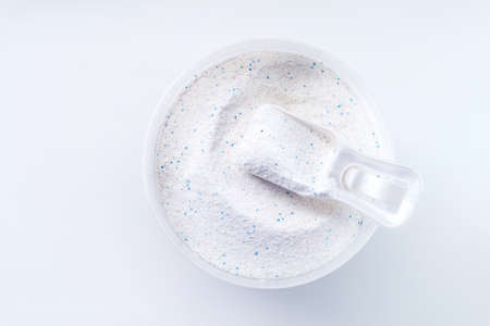 Detergent powder with measuring spoon for clothes washing. Laundry concept.