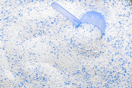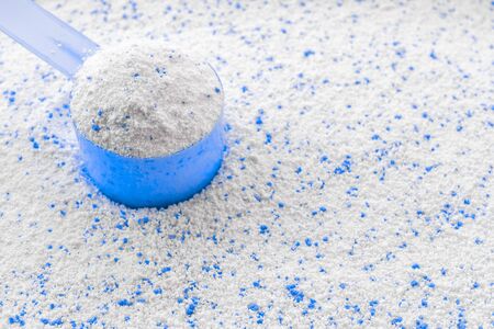 Detergent background. White wash powder with cup for laundry, washing machine. Soap clean texture with scoop. Dry cleaning, Chores of housewife concept. Regular washing