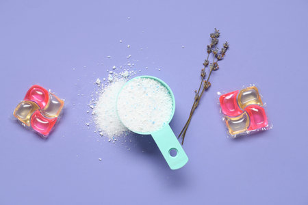 Blue laundry detergent sorts variety in powder and pod in washing dose