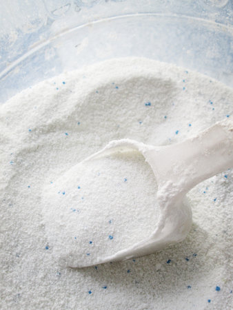 Clean detergent. White wash powder texture in cup or scoop for washing machine. Liquid soap laundry background. Eco style cleaning concept.