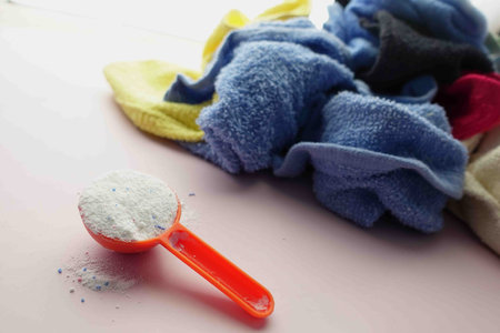 Detergent powder in measuring spoon for clothes washing. Laundry concept.