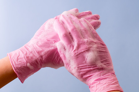 Closeup photo of hand wearing glove and sponge isolated over blue wall