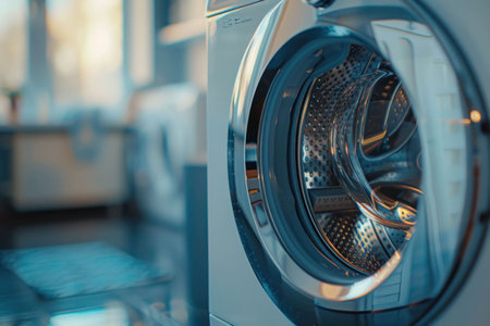 This close-up image showcases the intricate details of a modern washing machine drum with a reflective metallic surface, perfect for showcasing home appliance technology.