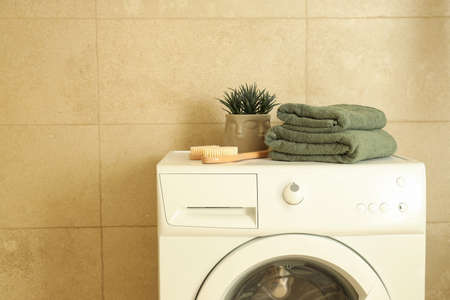 The process of unloading washed colorful clothes from the washing machine in the bathroom