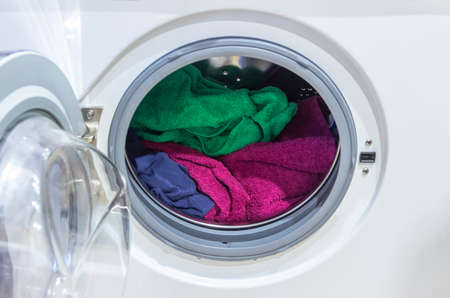 Washing machine with multicolored dirty towels on the floor near it. laundry washer with opened door. Side view. Close up