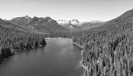 Landscape of mountain and forest of Cooper lake. Nature landscape. Cooper Lake in Washington. Scenic nature of popular hiking Cooper lake. Cooper lake with mountain landscape. Majestic mountains