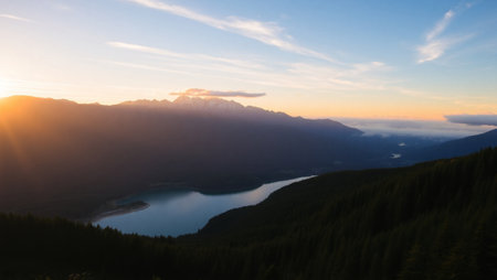 Beautiful alpine landscape with lake, mountains and forest at sunset