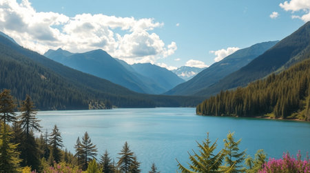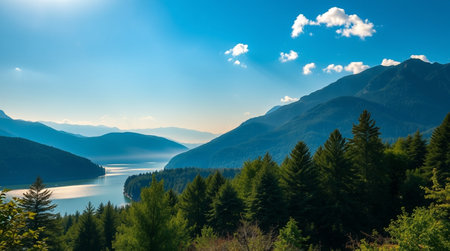 Mountain landscape with lake, forest and blue sky with white clouds