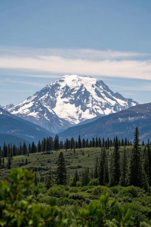 Majestic mountain peak rising above a valley shrouded in morning mist. Vast, snow-capped summit against a clear, vibrant sky. Green forested slopes and valleys