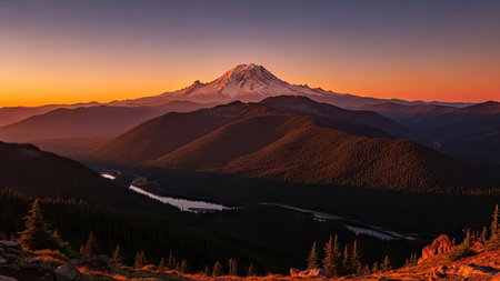 Majestic mount rainier at sunrise snow capped peak over serene lake and lush green forest