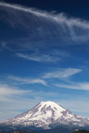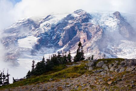 Mt. Rainier starting to be shrouded in fog on a sunny day showing the rugged terrain in Washington state