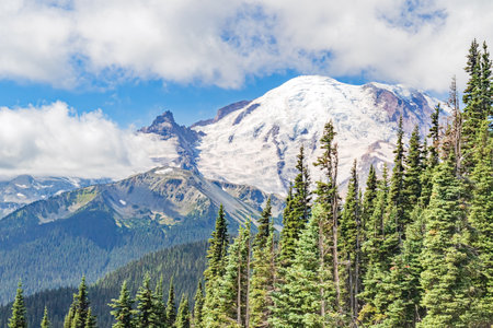 Forest and Mount Rainier at Mount Rainier National Park, Washington State, USA