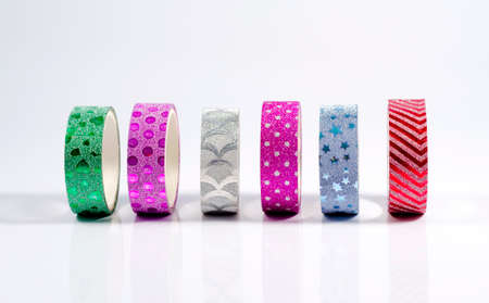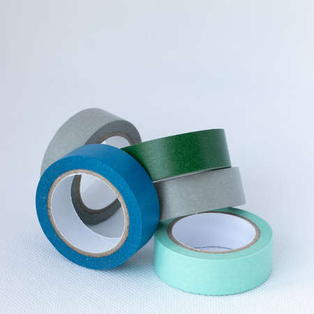 Several multicolored shiny rolls of adhesive packaging tape on a light background. Close-up of a group of objects