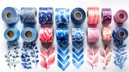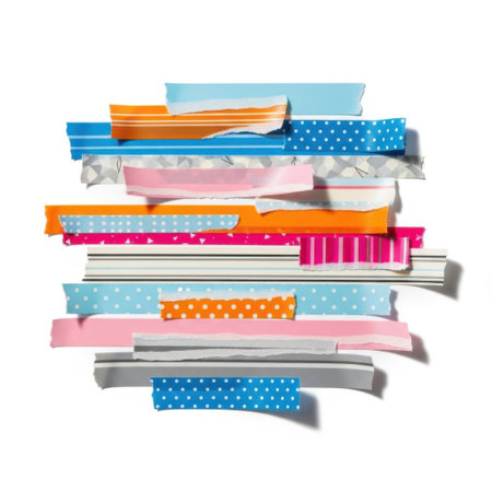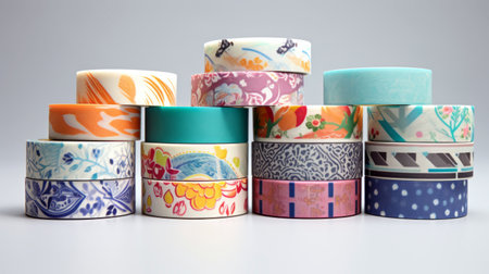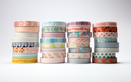 A collection of colorful washi tapes with various patterns, neatly aligned against a white background AI generated