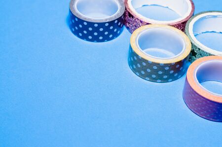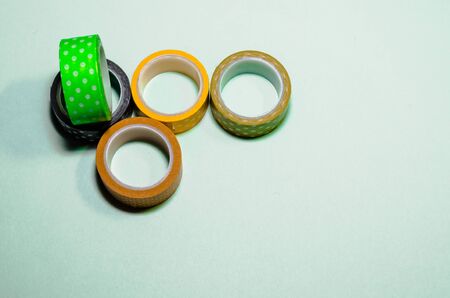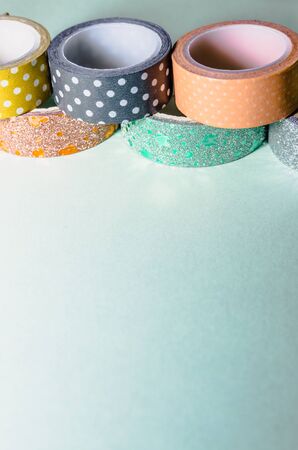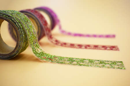 Rolls with scotch tape and decorative adhesive tapes for decorating gifts for the holidays. Background