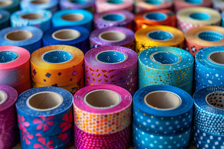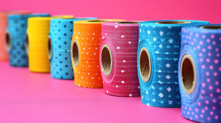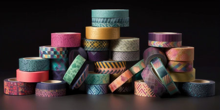 A collection of colorful decorative tapes arranged in a striking manner on a dark background, perfect for arts and crafts projects. Ideal for decorators and DIY enthusiasts.