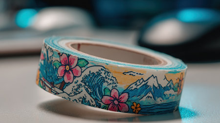 A close-up view presents a roll of washi tape adorned with floral and wave designs. The tape showcases vibrant colors including blue, pink, and yellow. The style appears artistic, with a shallow depth of field, set against a blurred background. Suitable for illustrative or decorative projects.