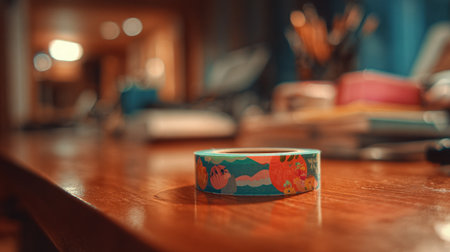 A roll of decorative tape sits on a polished wooden surface, illuminated by soft lighting. The image features a shallow depth of field, with a blurred background. The color palette includes warm browns and greens. Suitable for various design projects and commercial applications, the image is well-suited for print and digital media.