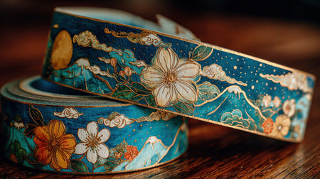 Two rolls of decorative tape are displayed on a wooden surface, showcasing intricate floral and landscape designs. The tape features vibrant teal, gold, and white colors, and the detailed artwork suggests a stylized Eastern aesthetic. This image would be suitable for various uses, including editorial and commercial applications.