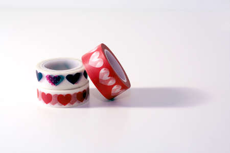 Tape rolls, masking tape rolls in stacks. Red and white tones. white background