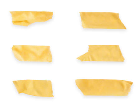 A collection of yellow masking tape pieces in different sizes and shapes on a dark surface.