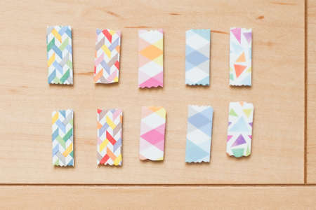 A vibrant collection of decorative tape rolls arranged on a wooden surface. Perfect for craft projects, scrapbooking, and enhancing design elements.