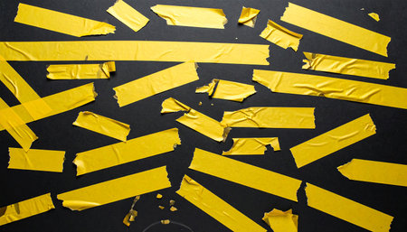 Numerous strips of yellow masking tape, some torn and wrinkled, are spread across a dark background.