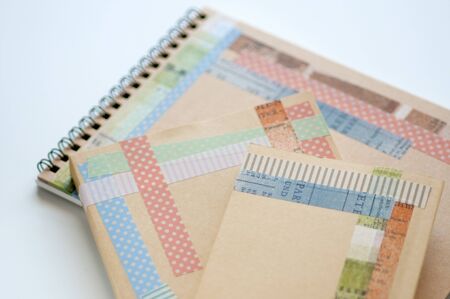 Stack of colorful duct tapes on a beige background. Back to school concept.