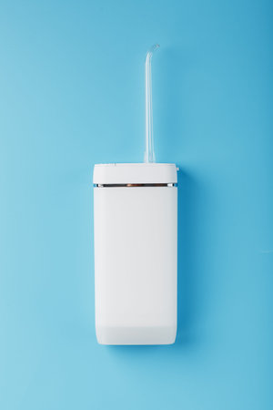 White oral irrigator on a blue background. A mobile device for brushing your teeth and a snow-white smile. Free space
