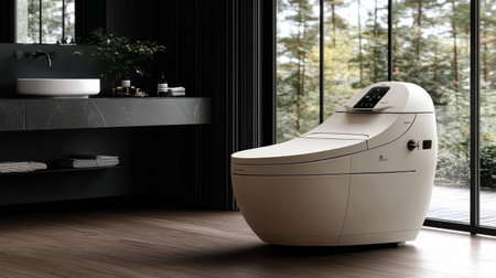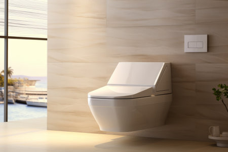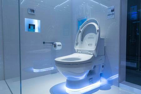 Smart toilet with interactive display and water projection in modern bathroom setting. That the image is generated using AI.